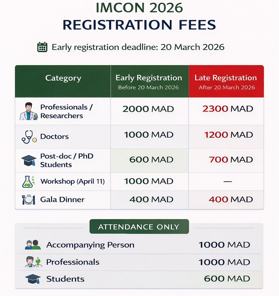 Reductions are available for participants under demand and after evaluation, contact the congress mail: imcon26@cm6.ma